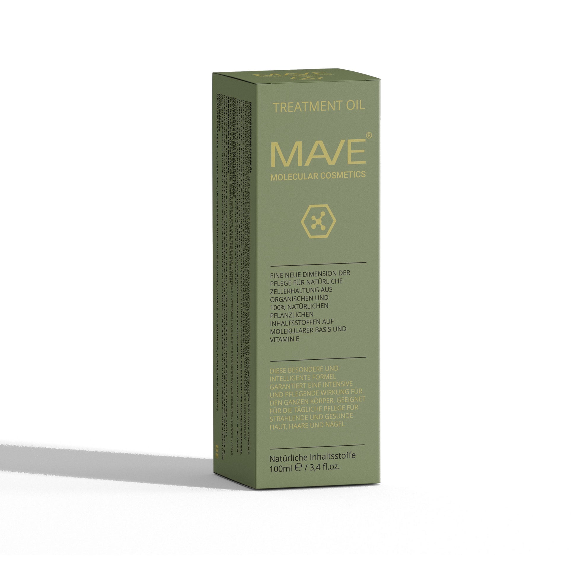 MAVE – Molecular Oil Treatment 100ml ist ein innovatives, 100 % natürliches Pflegeöl für Gesicht, Körper, Hände und Füße. Die Kombination aus Arganöl, Teebaumöl, Olivenöl-Molekularleiter und Vitamin E sorgt für intensive Feuchtigkeit, Regeneration und Schutz vor Hautalterung.