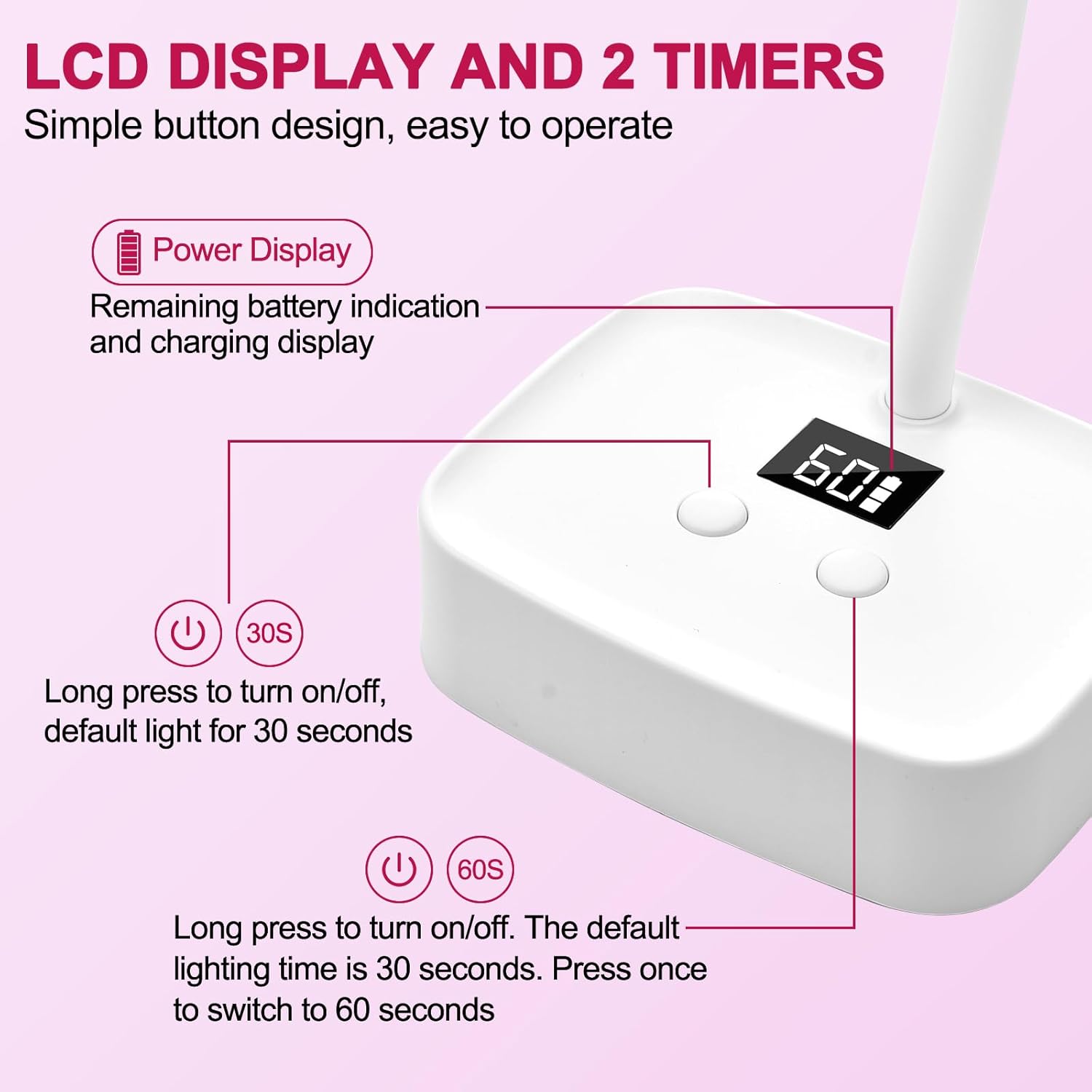 Мини UV-лампа CGBE идеально подходит для гель-лаков и дизайна ногтей дома или в салоне. Мощность 27 Вт и 9 UV + LED диодов (365 нм + 405 нм) обеспечивают быстрое и равномерное отверждение гель-лаков и наращиваний. Лампа оснащена интеллектуальным инфракрасным сенсором, который автоматически включается при приближении пальцев, а также двумя режимами таймера (30/60 секунд) для простого или сложного дизайна. Благодаря 360° регулируемой трубке и встроенному аккумулятору 1500 мАч мини-лампа портативна и удобна для использования в любом месте. Быстро, эффективно и удобно – профессиональный результат для ваших ногтей!